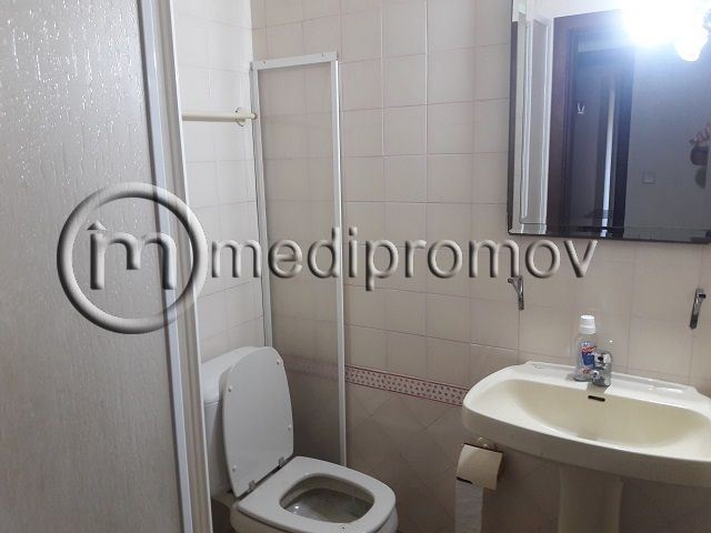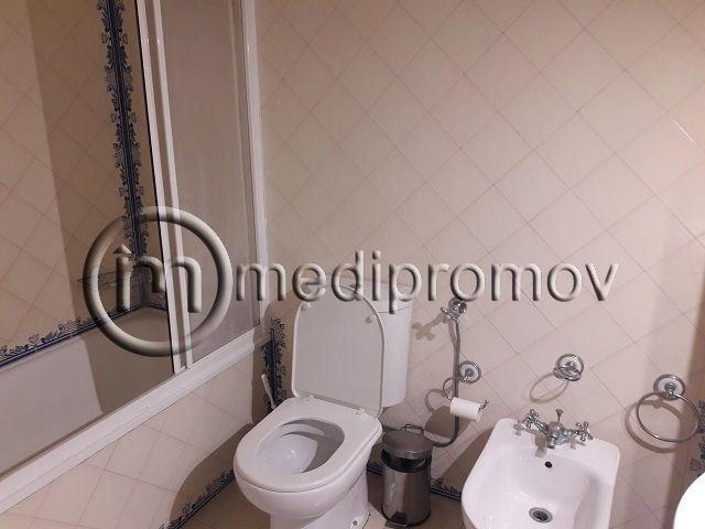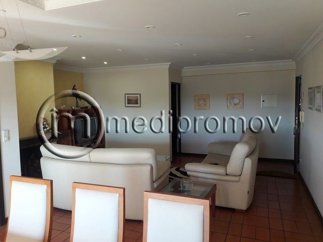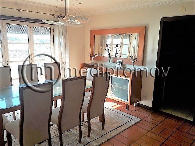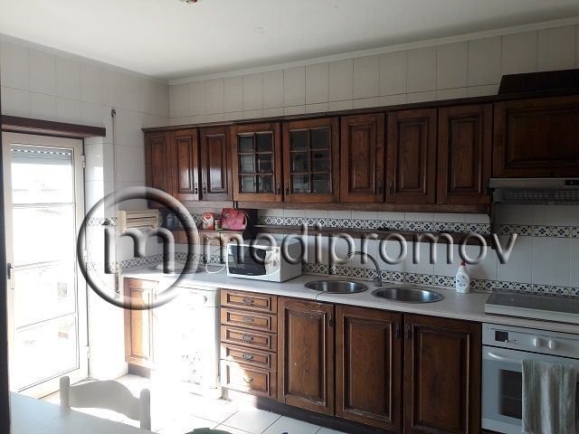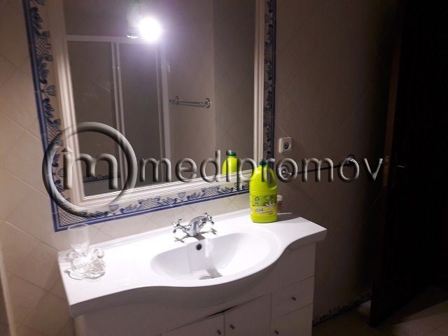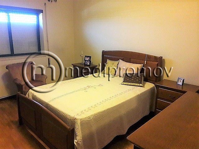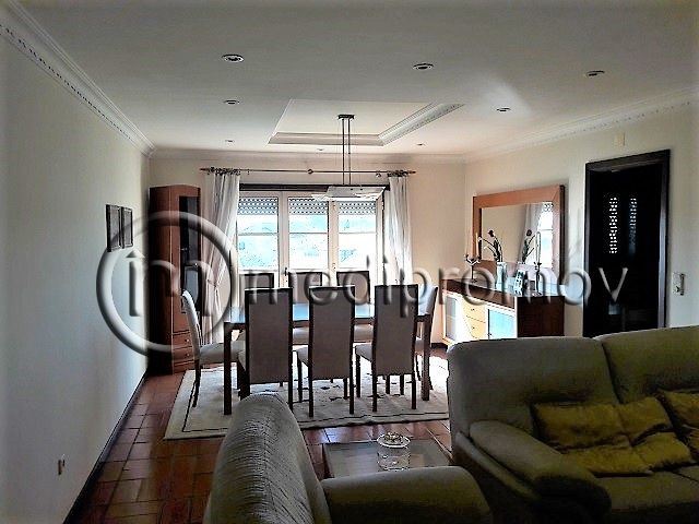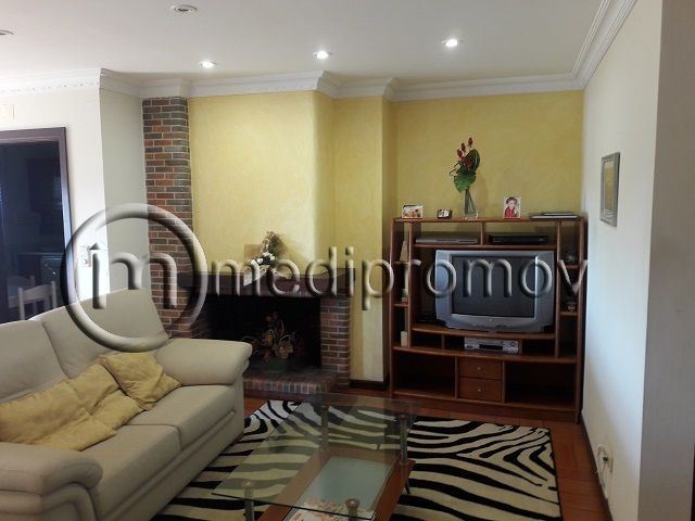 Apartamento T3, tem 3 quartos, um deles com casa de banho privativa, roupeiros, duas casas de banho uma com banheira e outra com base de duche, sala de estar com lareira e tectos com focos embutidos, cozinha, despensa, duas varandas e uma garagem fechada no logradouro do prédio.